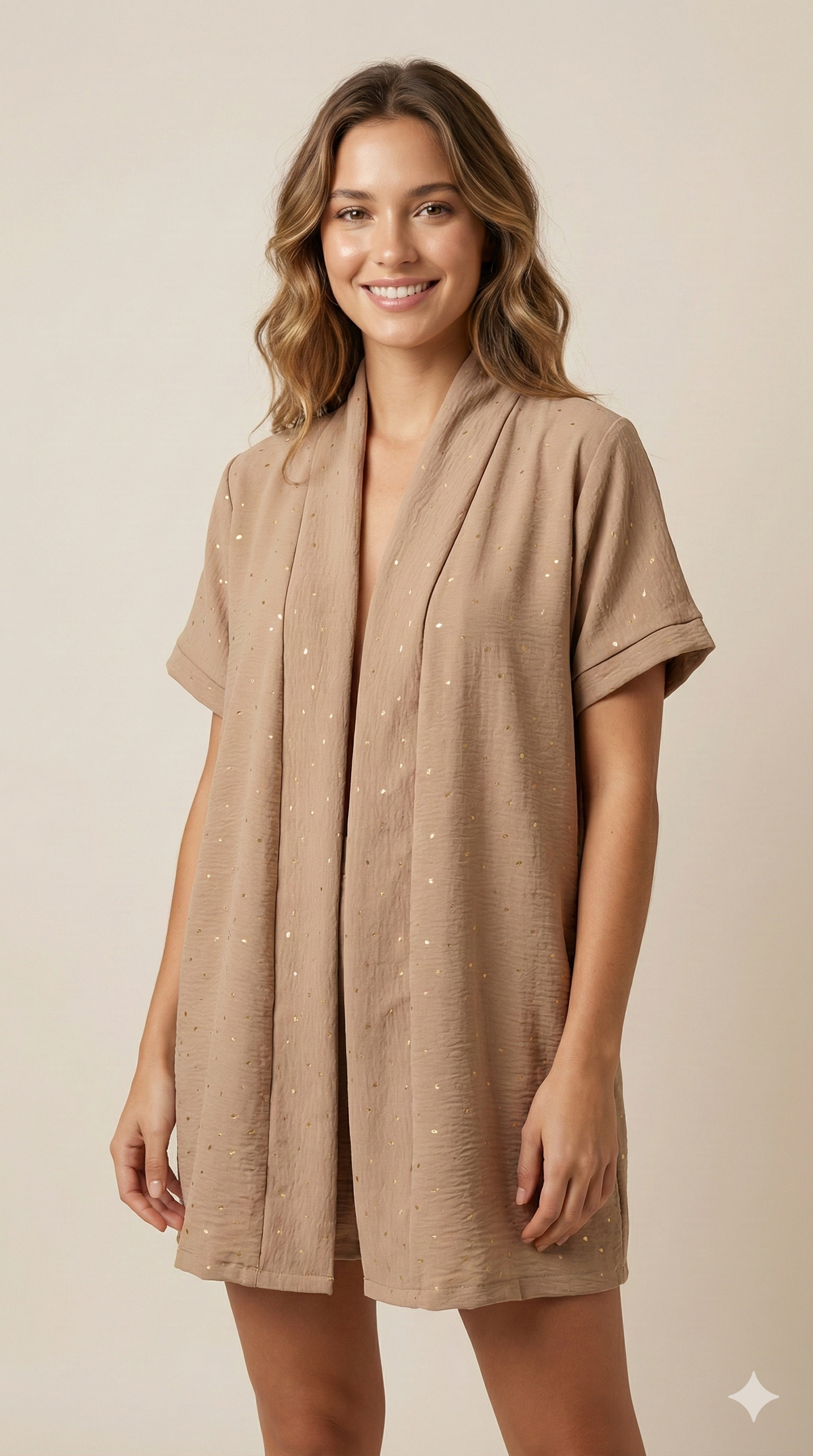 Su diseño es abierto (sin cinto ni botones) y de caída libre, pensado para usar como un saco liviano de verano. Las mangas cortas con dobladillo fijo le dan ese toque casual y moderno que buscabas.
