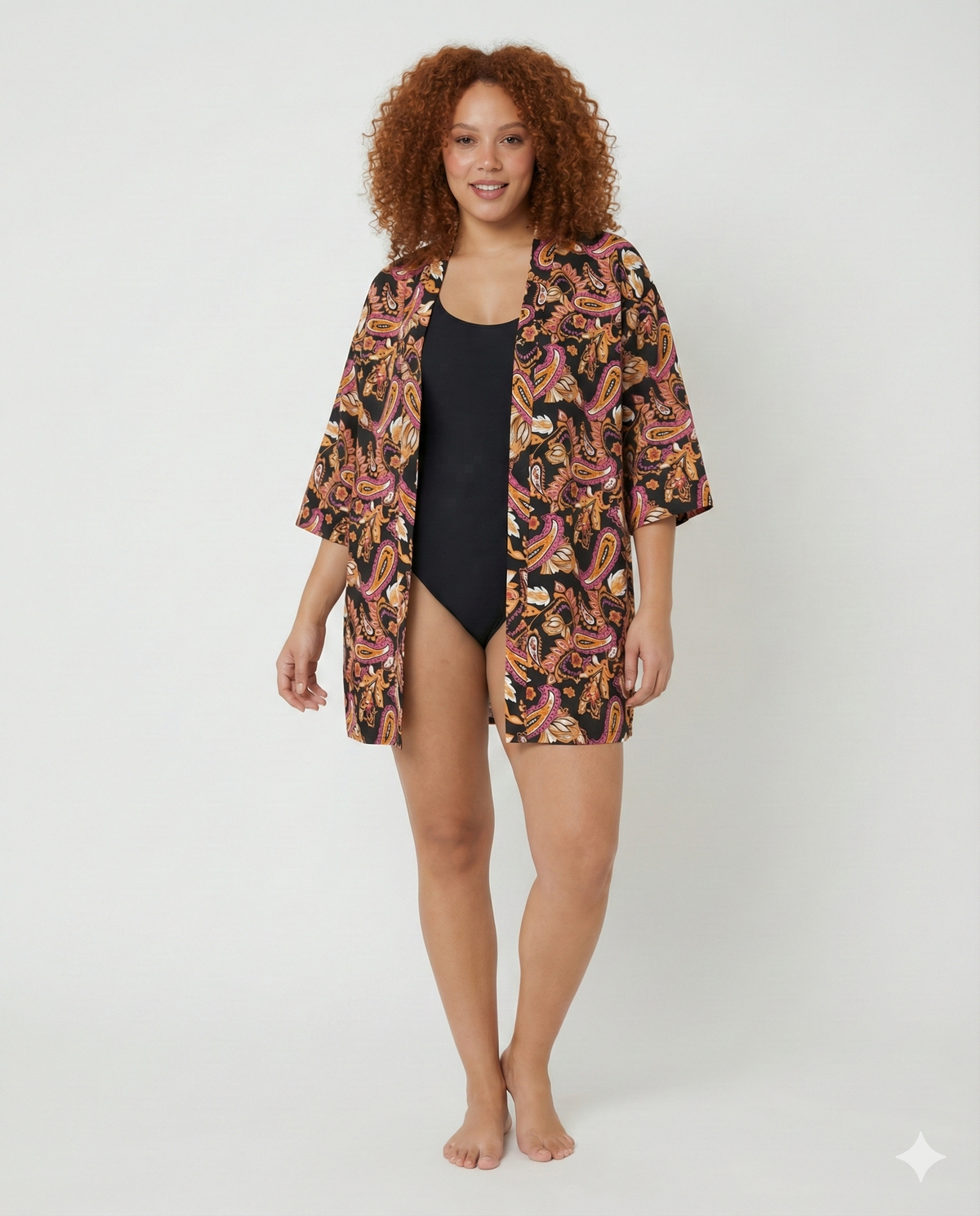 Su diseño es abierto y holgado, sin cinto ni bolsillos, para que sea lo más liviano y fluido posible. El largo es ideal, a la mitad del muslo, perfecto para usar sobre el pijama, bikini, incluso como complemento de cualquier look veraniego. Confeccionado en suave fibrana.