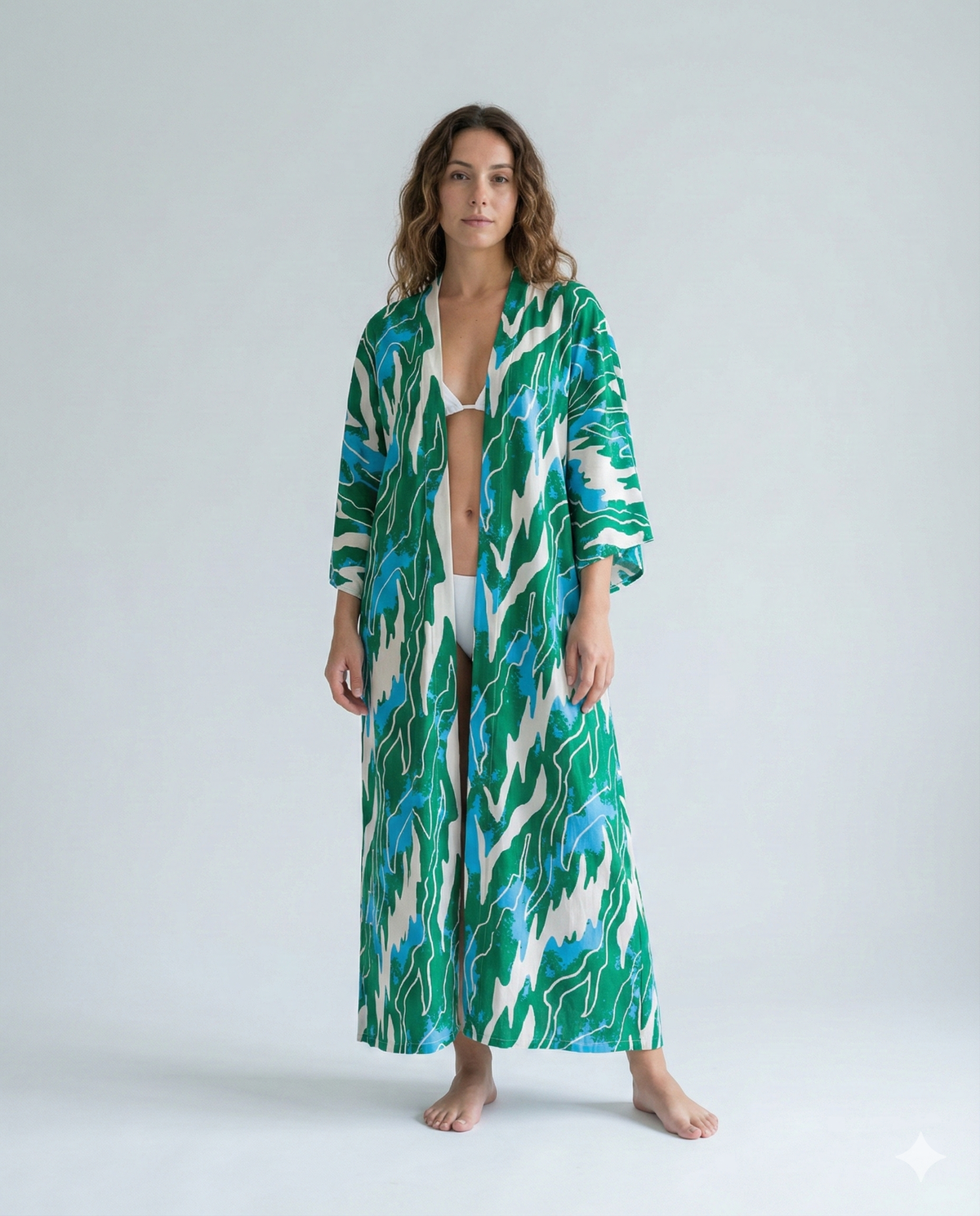 Su diseño es abierto y holgado, sin cinto ni bolsillos, para que sea lo más liviano y fluido posible. El largo estiliza y es perfecto para usar sobre el pijama, bikini, incluso como complemento de cualquier look veraniego. Con boton para que recojas las mangas hasta 3/4.
